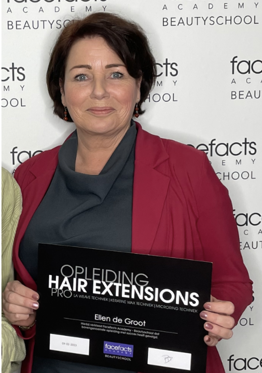 Ik heb in 2023 de opleiding voor hairextensions gevolgd en ook weer met succes afgerond. Hierbij heb ik mij gefocust op het plaatsen van t-tip extensions. Hierover kun je meer lezen bij service details.